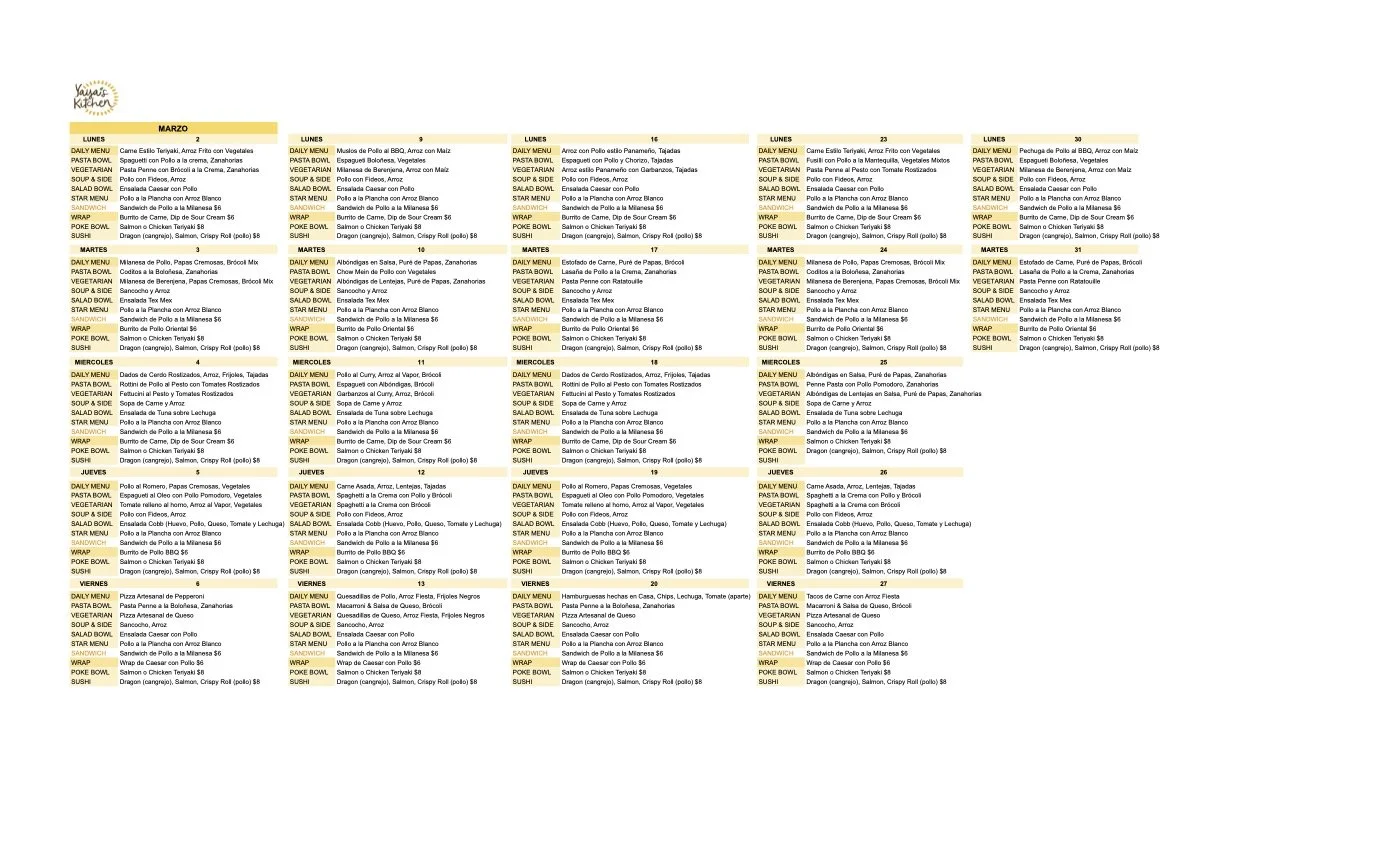 Los deliciosos menus del Yaya’s Daily Special incluyen recetas internacionales elaborados con ingredientes selectos y vegetales de temporada. Cada dia es una aventura culinaria diferente. Igualmente, el Yaya's Vegetarian Special, ofrece las opciones del menu, con sustituciones vegetarianas como albondigas de lentejas, hamburguesas de garbanzo o pizzas Margherita, entre otras.